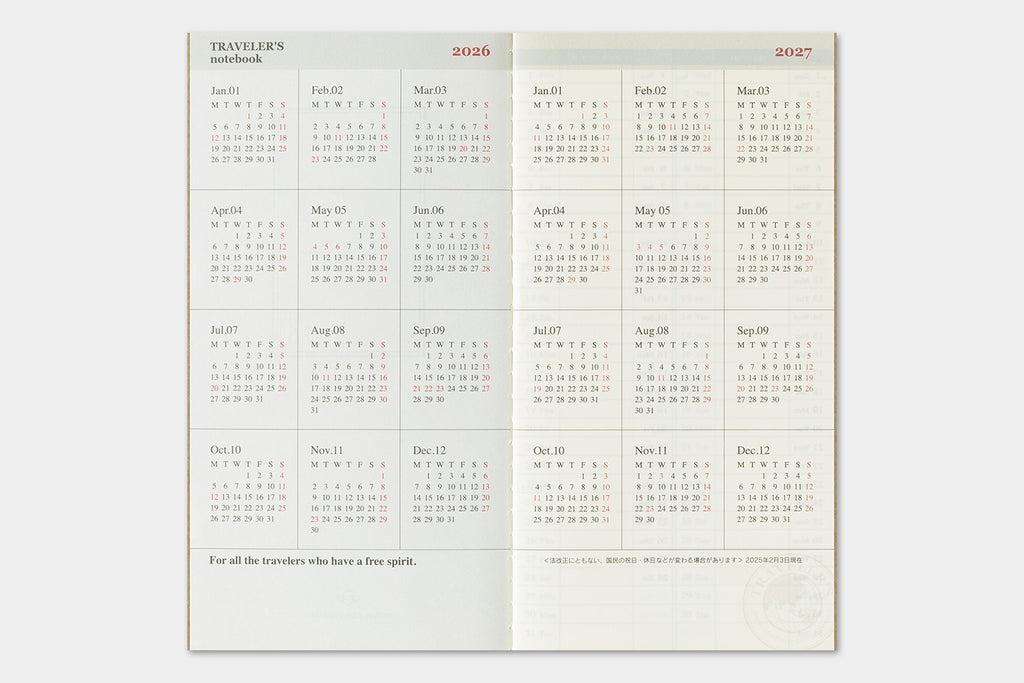 This is the 2026 Weekly + Memo Diary for TRAVELER'S Notebook. This format is the very popular and easy to use. It includes a weekly diary with a page for writing for each week. A single notebook covers six months. The MD paper used is simply great to write on. A guide and stickers included.