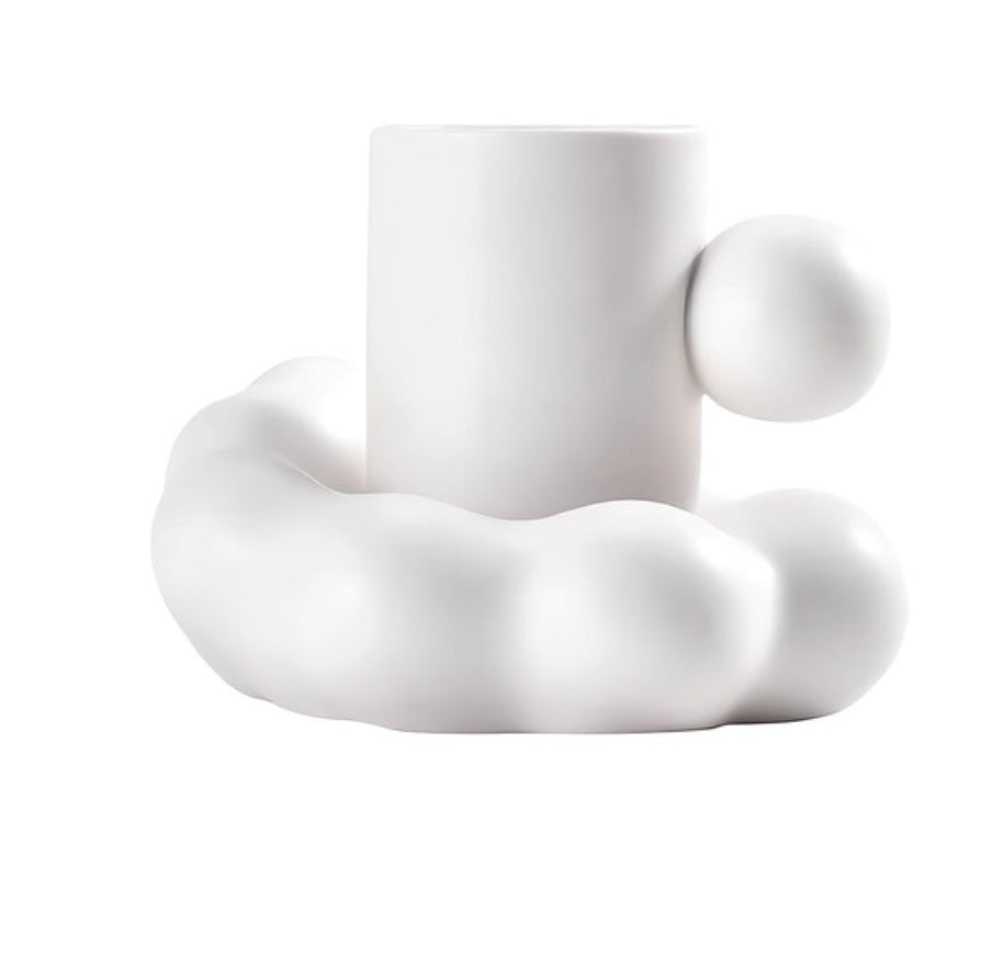 "Cloud" ceramic mug by TUTU - named after its cloud shape mug set design. The matching saucer mimics a cloud shape, creating a unique aesthetic. The mug's double-layer design provides excellent insulation, keeping your hands safe from heat. The rounded, chubby shape adds an artistic touch and enhances its charm. The ball-shaped handle adds a quirky twist to its design. The mug comes in four different pastel colours, each evoking a sense of calm and serenity.