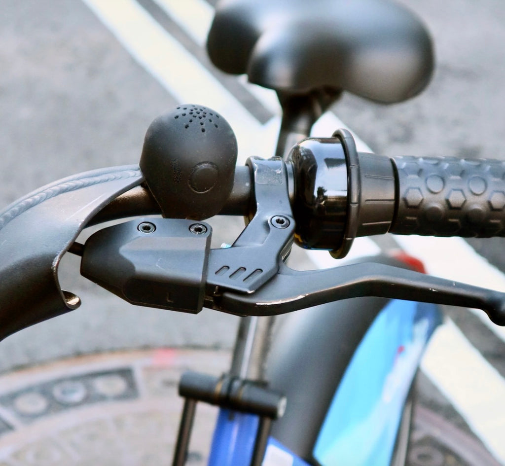 The safest bicycle bell is the loudest bicycle bell. This electronic bike bell offers a choice of 5 fun sounds: Car Horn, Vintage Bicycle Bell, Whistle, Harmonica, and a Train Whistle at 85dB. The splashproof, IPX4, E-Bell comes in a silicone case. Batteries included.