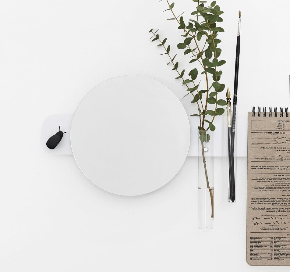 BUBA is a magnet board and organizer. Mounted on the wall, be it in the kitchen, corridor or living room, its simple form is versatile allowing for personal belongings to be hung or held in place by magnets. A acrylic mirror accessory (18 cm diameter) can be purchased separately, also magnetic.